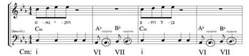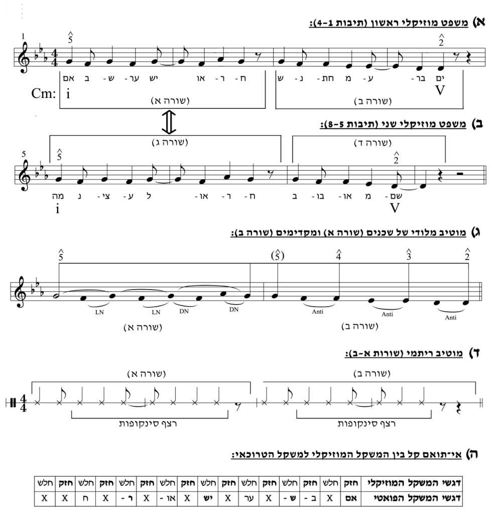 לחן הבית מורכב משני משפטים זוגיים, דומים וסימטריים, בני ארבע תיבות כל אחד (ראו: איור 1א–ב). המשפט הראשון מקביל לשורות א–ב בתמליל, והמשפט השני מקביל לשורות ג–ד. המשפטים בנויים משני מוטיבים מרכזיים: מלודי וריתמי. המוטיב המלודי מורכב משני חלקים (ראו: איור 1ג). בחלקו הראשון (שורה א), צלילים שכנים רבים (LN ו־DN) הסובבים את המדרגה החמישית, סול,[11] ובחלקו השני (שורה ב), רצף צלילים מקדימים (anticipations) בירידה סולמית עד העצירה על המדרגה השנייה, רה.[12]