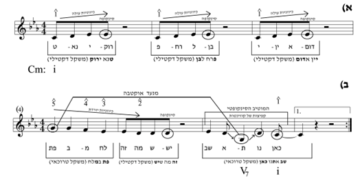 המוטיב הריתמי בנוי מרצף סינקופות, היינו, רוב צלילי המנגינה מוזזים ומושרים דווקא על הפעמות החלשות במקום על החזקות (ראו: איור 1ד). כתוצאה מכך קיים אי־תואם מסוים ברמת התאמת־העל בין רגלי המשקל הטרוכאי בקריאה הטבעית של הטקסט לבין הלחן המושר עם הפעמות המוזיקליות החלשות (ראו: איור 1ה). רצף סינקופטי כזה אינו שכיח בלחניה של שמר, והוא מעניק למנגינה אופי מיוחד, המתאים יותר למקצבים לטיניים, דוגמת סמבה ברזילאית (Samba) ובוסה נובה (Bossa).[13]