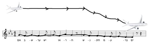 הרעיונות הטקסטואליים מובעים גם בלחן. הפועל "נחת" מלמד שהאורח טס במטוס; ושמא זו הסיבה שבהקדמת השיר מושמעת דגימת קול של מטוס ממריא. כאמור, הכיווניות המלודית סובבת סביב המדרגה החמישית (סול) דרך צלילים שכנים למשך שתי תיבות, ואז יורדת בהדרגה אל המדרגה השנייה (רה). כיווניות זו יוצרת ציור מילים (word painting) של טיסת מטוס בשמיים עד נחיתתו על הקרקע (ראו: איור 3).[18]