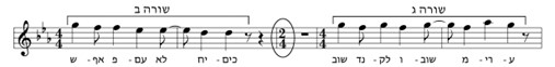 לחן הפזמון קונטרסטי לבית, ונחלק לשניים: שלוש התיבות הראשונות לעומת הארבע האחרונות (ראו: איור 2א–ב בהתאמה). בשלוש התיבות הראשונות המשפטים המוזיקליים קצרים, בהתאם לשורות המלל של הפזמון (א–ג), ואחרי כל אחד מהם ישנה הפסקה. שלוש התיבות זהות, והכיווניות המלודית של כל אחת מהן עולה, בניגוד לירידה שאפיינה את מנגינת הבית. המוטיב הריתמי הסינקופטי בטֵל, למעט סינקופה אחת המופיעה בצליל האחרון של כל תיבה (מי במול). סינקופה זו נגרמת כתוצאה מהמשקל השירתי הדקטילי בין שלוש ההברות, המושר במשקל מוזיקלי זוגי בן ארבעה רבעים.